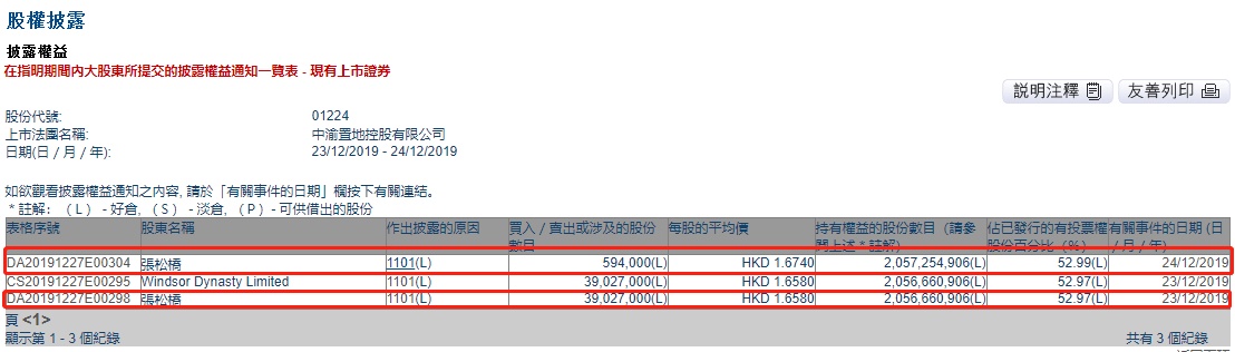 智通财经APP获悉,联交所最新资料显示,12月23日和12月24日,主席张松桥共增持中渝置地(01224)3962万股,每股作价分别为1.658港元和1.674港元,总金额约为6570万港元。增持后最新持股数目约为20.57亿股,最新持股比例为52.99%。
