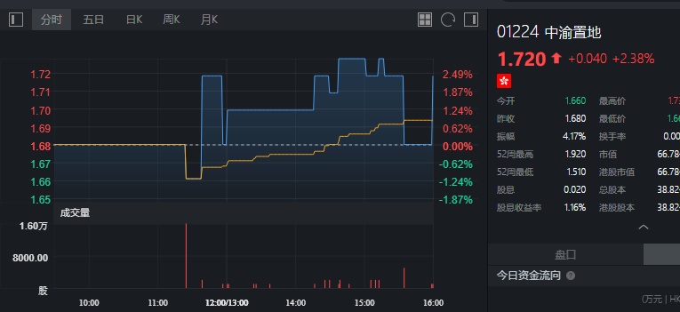 截至今日收盘,中渝置地涨2.38%,报1.72港元。
