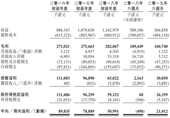 于2016年-2018年以及2019年六个月,公司的收益分别为8.86亿港元、10.80亿港元、11.63亿港元和5.65亿港元。其中2016年-2018年复合年增长率约为14%。
