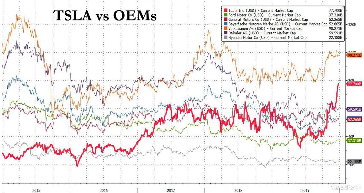 周五美股盘中,特斯拉股价一度升至433美元,市值778亿美元。该市值已经超过了现代汽车(220亿美元)、福特汽车(370亿美元)、通用汽车(520亿美元)、宝马(520亿美元)以及戴姆勒(600亿美元)。