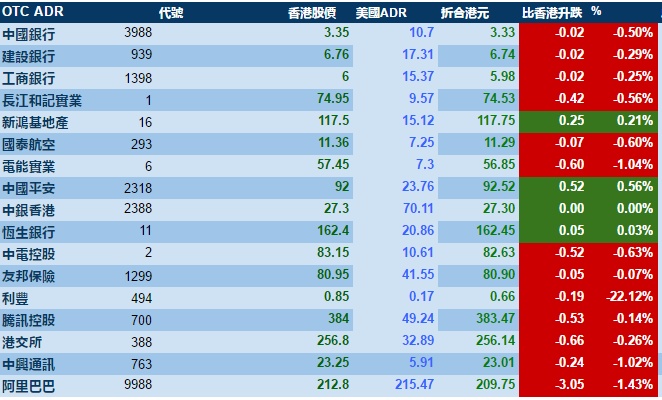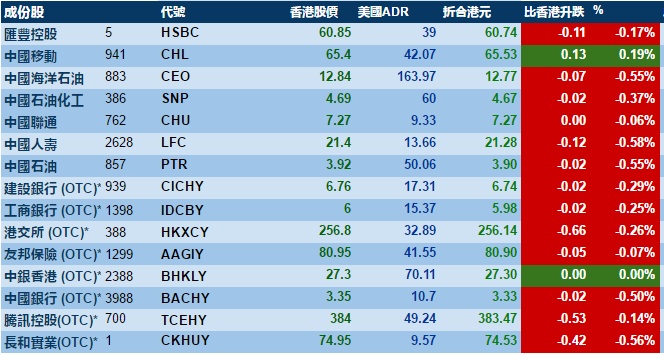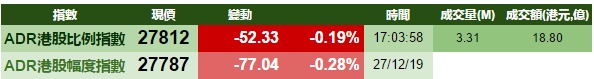 智通财经APP获悉,周五美股窄幅上落,港股ADR指数全日偏软,按比例计算,收报27812点,跌0.19%。