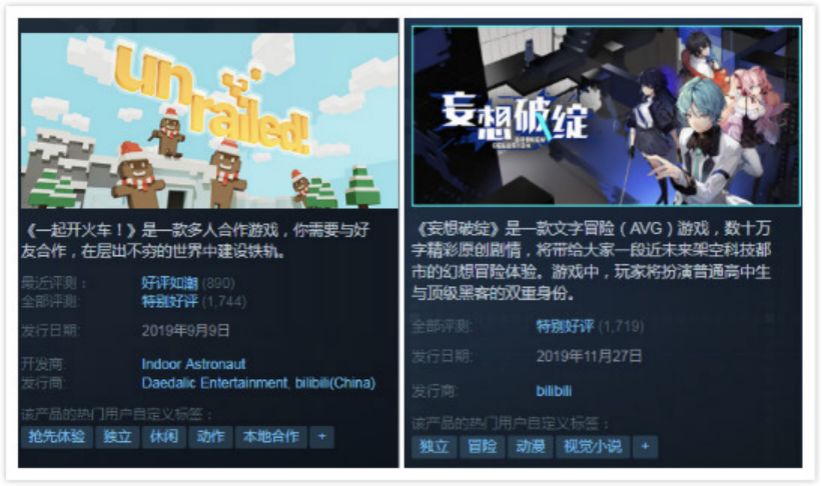 今年7月B站举办了独立游戏发布会,发布了《一起开火车!》《妄想破绽》等五款类型各异的独立游戏。目前《一起开火车!》《妄想破绽》已在Steam上线,《斩妖行》和《重明鸟》还将在明年登陆PS4平台。