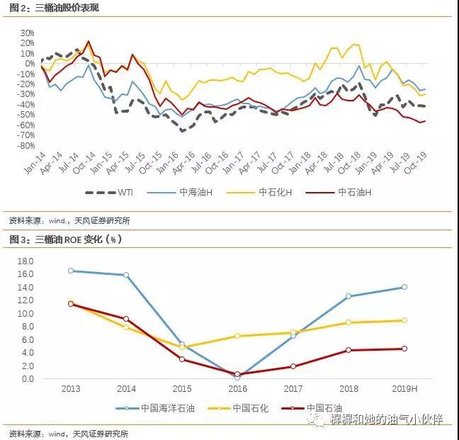 对于油公司的估值,短期油价波动可以看作扰动因素,远期油价和成本的变化,才是决定长期盈利能力中枢和合理估值水平的核心。2014年油价见顶之后的近6年里,三桶油表现出差异性:中海油凭借上游成本持续下降,ROE在2018~2019年已经接近2013-2014年油价高位时期。中石化则因其下游炼化体量最大,而炼化在2016年之后进入景气周期,ROE也得到较好恢复。中海油、中石化的股价表现都好于油价。反观中石油,作为利润以上游业务为主的公司,成本控制不尽人意,导致ROE从16年低点恢复不明显,股价表现也是三桶油中最弱的。