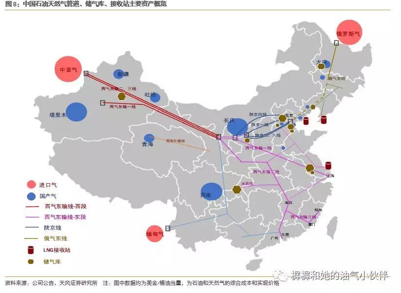中国石油(股份公司)除了拥有国内最大的油气资源,目前还拥有最为庞大、相对完整的油气储运基础设施资产。包括西气东输管道、陕京管道、俄气东线3条大动脉,以及支干线、联络线,共3.3万公里天然气管线、1万公里油管线、近1万公里成品油管线;唐山、大连、如东3大LNG接收站,共计周转能力1900万吨/年;呼图壁、相国寺等10座地下储气库,共计采气能力110亿方。