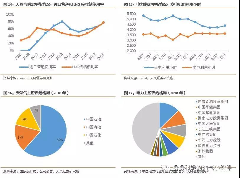 销售气价=门站价+输配环节价差;门站价=发改委根据替代能源公式定价;井口价=门站价-管输费。天然气价格市场化改革落后于电力,还没有形成所谓的竞价机制,管道气价格仍然由发改委调价,冬季保供期企业在许可的范围内进行上浮。从产业链环节的竞争格局来看:1)供气环节,目前国内天然气生产和进口仍然垄断在三桶油(主要是中石油)手中。即使定价机制改革完成,垄断的供给格局在短期之内不会有实质变化。2)输气环节,原本国内天然气主干管道绝大部分在中石油手中,未来改部分资产将由国家管网公司承接。管输费按照“成本+准许收益”的重新核定已于2017年完成。3)配气+售气环节,是城市燃气公司的业务范围,特许经营权带来的区域性垄断格局不会明显变化。