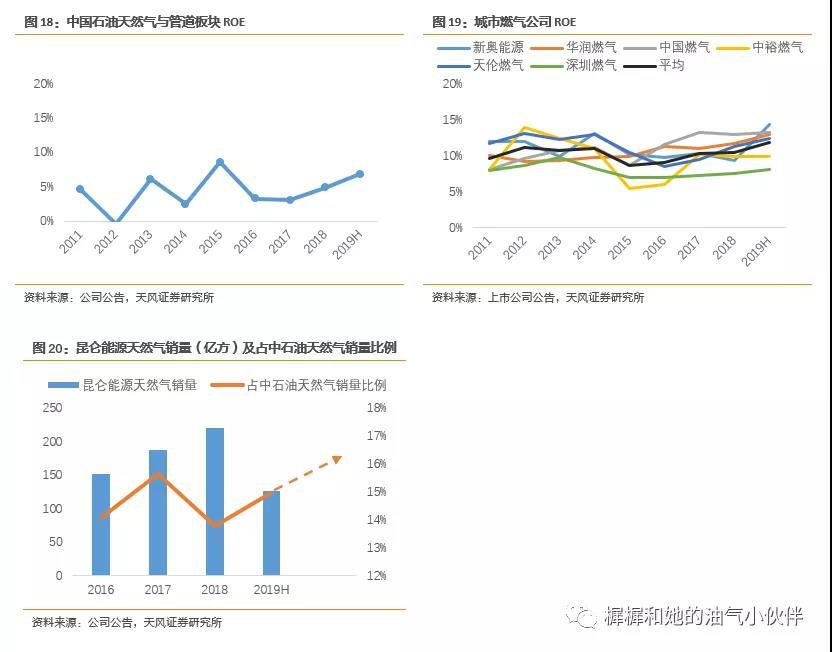 天然气产业链上下游盈利冷热不均。以2019年上半年为例,中国石油的天然气与管道板块ROA=7%,城市燃气公司的ROA高达12%(年化)。