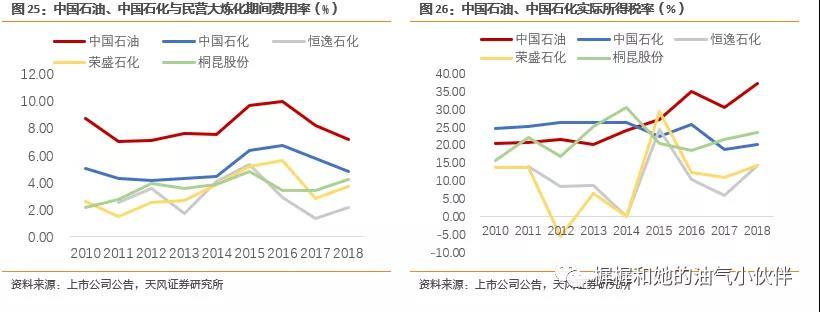 中国石油2018年实际所得税率高达37%。原因除了少部分来自国外经营单位高所得税率之外,更重要是机构庞大,子公司、孙公司数量多,盈利主体和亏损主体之间不能互相抵扣。另外,中国石油在期间费用率方面,也明显高于中国石化,更高于民营炼化企业。国企改革,瘦身健体、压减法人数量是趋势,在费用率和所得税方面有望带来改观。
