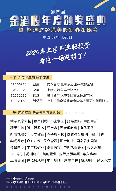 “第四届金港股年度颁奖盛典暨智通财经港美股新春策略会”2020年1月9日在深圳启幕。该活动由国内领先的港美股资讯平台智通财经与同花顺财经共同主办,宝新金融、云锋金融战略合作,大路演会议支持,奥盈全程支持。