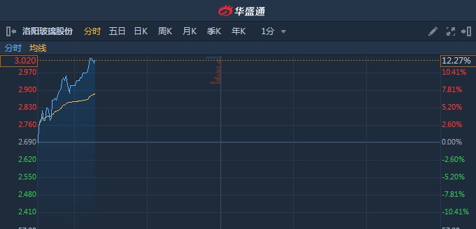 智通财经APP获悉,洛阳玻璃股份(01108)延续涨势,早盘A股涨停,H股续涨逾12%。截至10时16分,涨12.27%,报价3.02港元,成交额2325万。