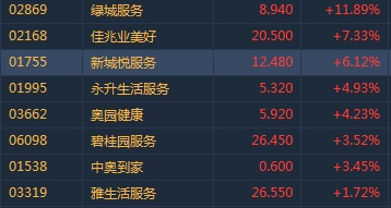 截至11时22分,绿城服务(02869)涨11.89%,报价8.94港元,盘中高见9.59港元,创历史新高。佳兆业美好(02168)涨7.33%,新城悦服务(01755)涨6.12%,盘中高见12.5港元,创历史新高。永生生活服务(01995)涨4.93%,盘中高见9.33港元,创历史新高。奥园健康(03662)涨4.23%,宝龙商业(09909)涨4.84%,碧桂园服务(06098)涨3.52%。
