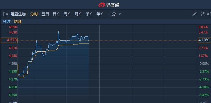 智通财经APP获悉,维亚生物(01873)发布公告称,正与朗华制药讨论战略投资及合作。该股盘中突破多条均线,截至11时39分,涨4.1%,报价4.57港元,成交额664.3万。