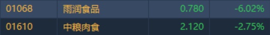智通财经APP获悉,港股猪肉概念逆市走弱,相关个股股价受挫,截至14时17分,雨润食品(01068)跌6.02%,报价0.78港元,中粮肉食(01610)涨2.75%。
