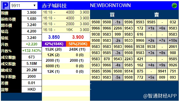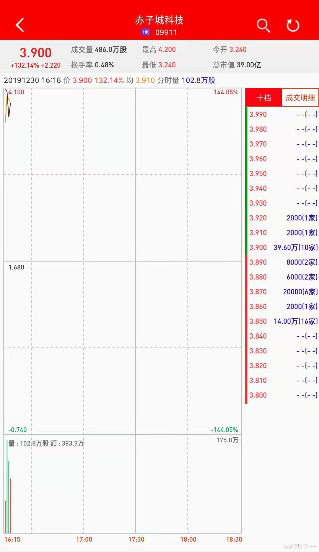 智通财经APP获悉,赤子城科技(09911)将于12月31日挂牌,今日暗盘开盘大幅上涨,截止到发稿,辉立证券暗盘交易显示其报价3.90港元,较招股价1.68港元涨132.143%。每手2000股,不计手续费,每手赚4440港元。