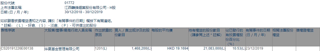 智通财经APP获悉,联交所最新资料显示,12月23日,华夏基金减持赣锋锂业(01772)146.82万股,每股作价19.16港元,总金额约为2813万港元。减持后最新持股数目约为2108.3万股,最新持股比例为10.53%。