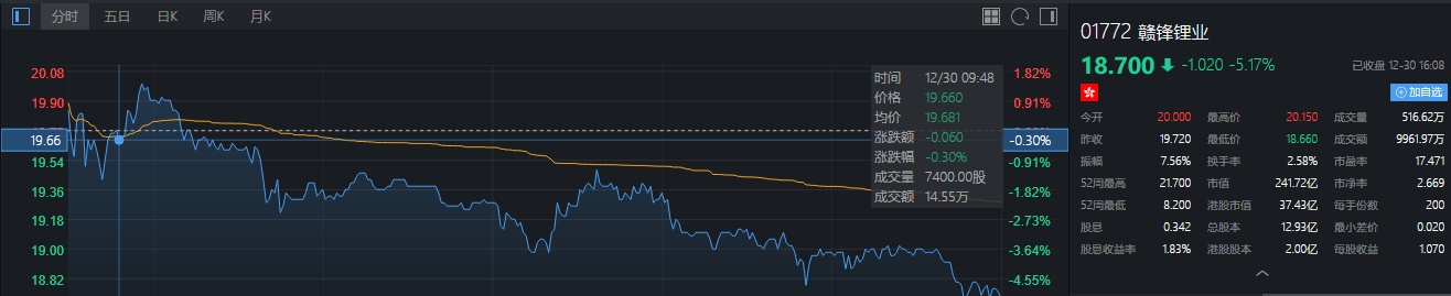 截止至12月30日收盘,赣锋锂业跌5.17%,每股报价18.70港元。