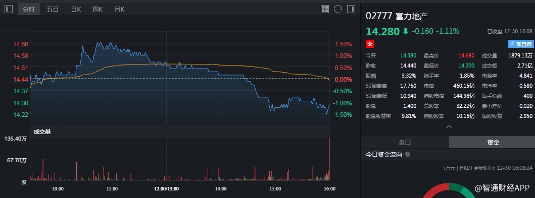 截至今日收盘,广州富力(02777)跌1.11%,报14.28港元。