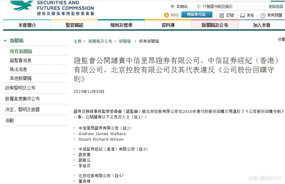 智通财经APP获悉,12月30日,香港证监会公布,就北京控股(00392)等在2016年进行的股份回购交易违反了《公司股份回购守则》一事,公开谴责以下公司及人士:
