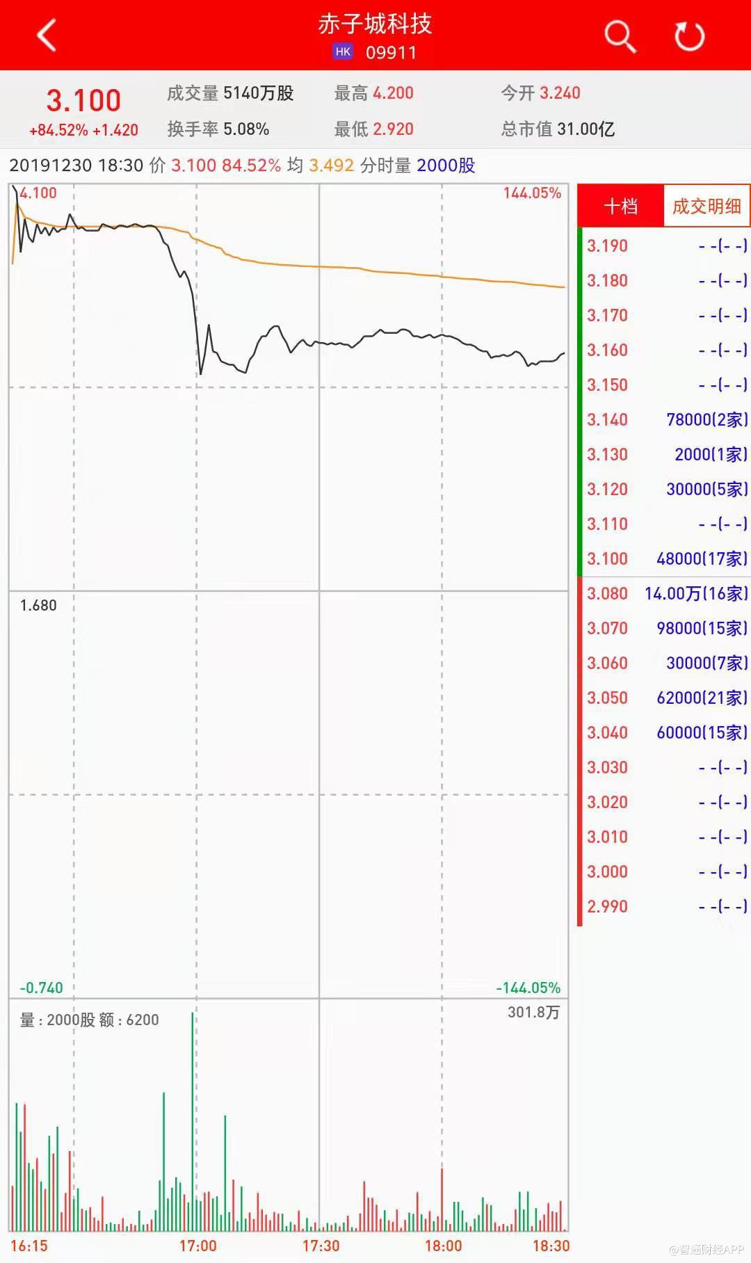 智通财经APP获悉,赤子城科技(09911)将于12月31日挂牌,截至收盘,辉立证券暗盘交易显示其报价3.1港元,较招股价1.68港元涨84.524%。每手2000股,不计手续费,每手赚2840港元。
