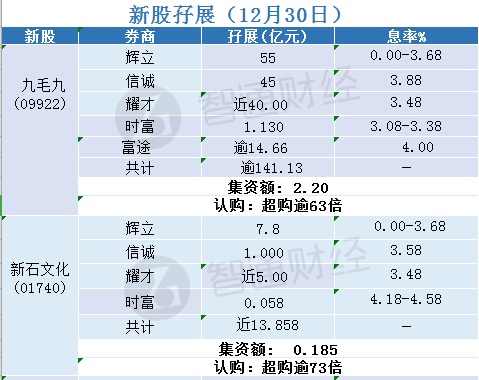 智通财经APP获悉,12月30日,九毛九(09922)、新石文化(01740)、光荣建筑(09998)、丽年国际(09918)、三和精化(00301)、Infinity L&T(01442)、尚晋(02528)、CTR(01416)、旷世(01925)、天泓文创(08500)正在招股中。