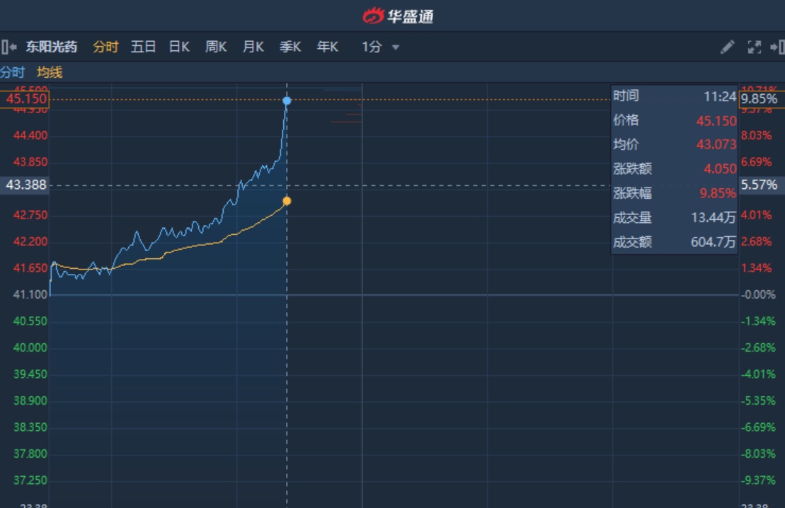 智通财经APP获悉,东阳光药(01558)盘中放量飙涨逾10%,突破多条均线。截至11时23分,涨10.34%,报价45.35港元,成交额2.405亿。