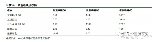 2019年12月27日,黄金Ⅲ(申万)指数收于6962.79点,环比上周上涨5.74%,跑赢上证综指5.73个百分点,跑输有色板块1.07个百分点;较上月同期上涨14.04%,跑赢上证综指9.41个百分点,跑赢有色板块0.05个百分点;年初以来累计上涨24.57%,跑赢上证综指4.08个百分点,跑赢有色板块1.66个百分点。