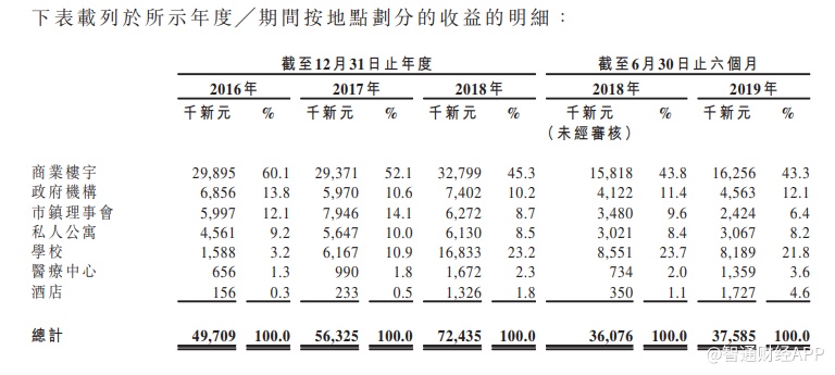 目前该公司提供清洁服务的场所包括体育馆、医疗中心、购物商场、商业及工业楼宇、学校、酒店、私人公寓及新加坡市镇理事会的公共出入区域。其经营范围不仅限于新加坡,亦为泰国的私营客户提供私人住宅、办公室、酒店及工业楼宇的普通清洁服务。公司超过40%的收入来自商业楼宇,约22%收入来自学校,其他占比较小。截至2019年6月末,该公司雇佣超过2800名员工,拥有319份进行中服务合约(不包括一次性合约)。