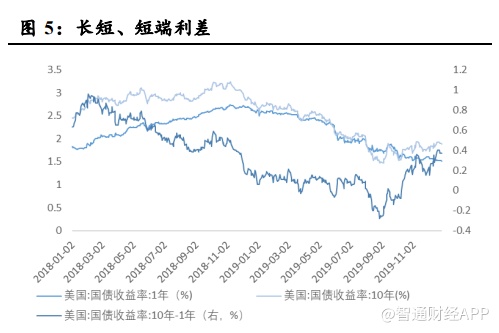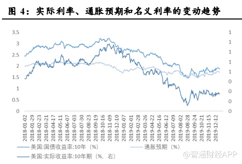 目前市场大多对美国2020年度经济相对乐观,我们认为2020年上半年的美国经济或将继续走低,这将会形成一定的预期差,带动长短利率的再次下行,催化实际利率的下行。