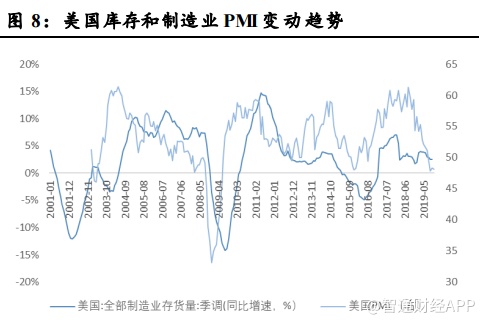 从美国库存和制造业PMI周期变动情况看,PMI是库存变动的领先指标,目前PMI仍低于荣枯线。
