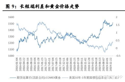 综上所述,从利率角度,我们认为2020年上半年长端利率有望下行,通胀预期有望上行,带动实际利率的下行,同时长短端利差有望继续缩窄,推升黄金价格的上涨。