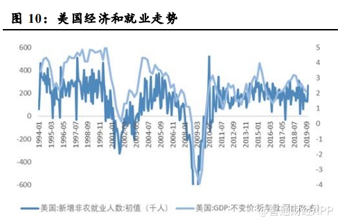 从库存周期来看,10月份的制造业存货同比增速为2.45%,从历史上看,未滑向负增长的区间,不同于中国即将开启的补库行为,我们认为美国工业库存仍将下滑,需求仍有下滑动力,最早要到2020年下半年才能开启新一轮补库行为。基于此,美国经济在2020年上半年仍有最后一跌,随后在库存周期下带动下或将短期企稳。