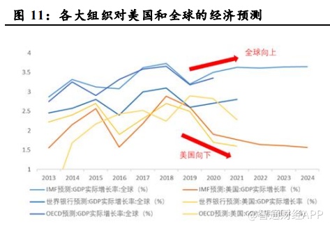 2020年的美国经济相对非美国经济将呈现变弱趋势,削弱美元信用,带动黄金价格的上涨。美国仍未走完本轮PMI周期的下行期,其PMI的企稳回暖短期或难以实现,从节奏上看,2020年上半年或是其相对非美国经济体最衰弱时刻。根据IMF、OECD、世界银行的预测,2020美国经济呈现下滑趋势,而全球经济呈现弱复苏。从全球和美国相互背离的经济趋势看出,美国经济(美国信用)将在2020年得到削弱,从而带动黄金价格的上涨。