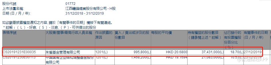 智通财经APP获悉,联交所最新资料显示,12月27日,朱雀基金减持赣锋锂业(01772)99.58万股,每股作价20.68港元,涉及总金额约为2059.31万港元。减持后最新持股数目约为3743.1万股,最新持股比例为18.70%。