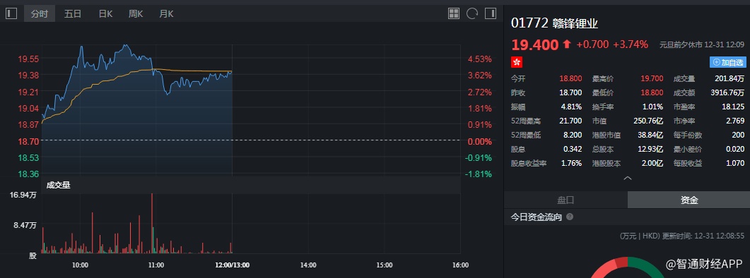 截至今日收盘,赣锋锂业(01772)涨3.74%,报19.40港元。
