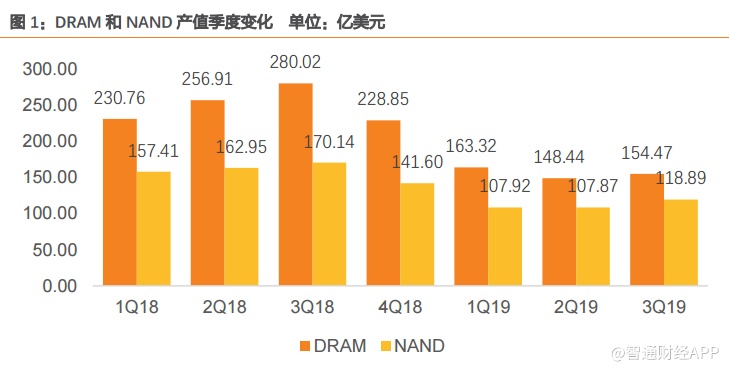 在整个电子产业链中,存储芯片扮演着至关重要的角色。存储芯片分为闪存和内存,闪存包括NAND FLASH和NOR FLASH,内存主要为DRAM。DRAM与NAND三季度总产值均提升,分别为154亿美元、119亿美元,环比增速分别为 4.1%、10.2%。