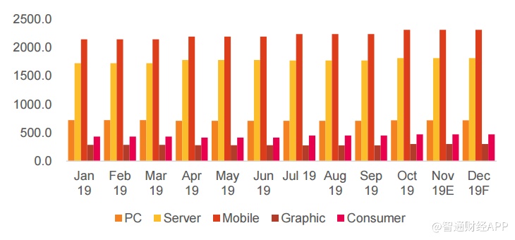 2019年DRAM月产能(按下游应用分类) 单位:Million Units