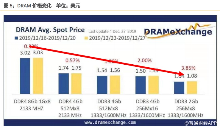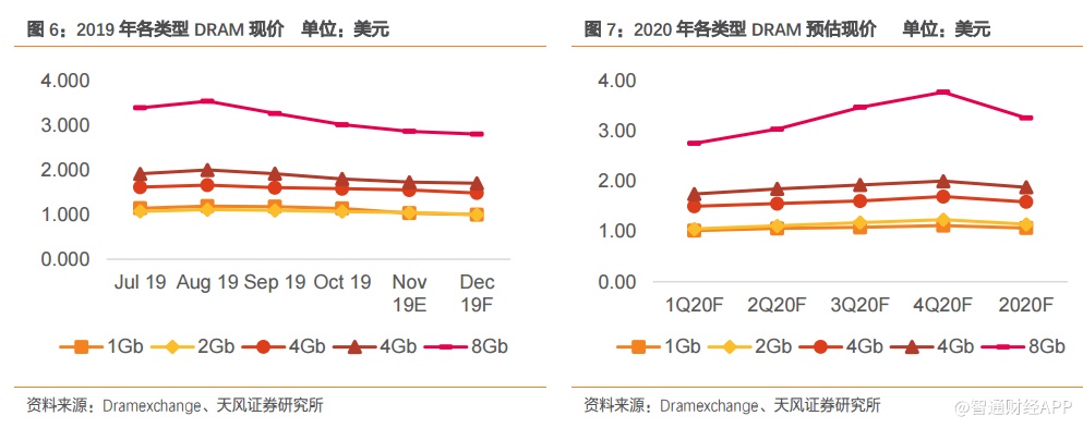 随着三大龙头库存消化与需求端拉动力增强,DRAM价格下跌趋势收紧,供需情况有望持续改善,明年将上涨。根据 Dramexchange 的预测显示,2020年DRAM的价格均有所上涨。
