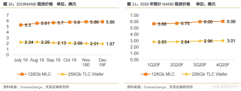 根据 Dramexchange 的预测显示,2020 年 DRAM 的价格均有所上涨。第三季度 NAND 现货价格跌幅持续收紧,预计明年价格将有所上升。