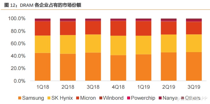 DRAM市场主要被三星、SK海力士和美光三大巨头垄断,三者占有市场约95%的份额,其中三星拥有40-50%的市场份额,且在19年市场份额占比呈上升趋势。三季度SK海力士的DRAM芯片市场份额为28.6%,再加上三星电子46.1%的份额,这两家韩国芯片制造商的DRAM市场份额在第三季度达到了74.7%,美光的DRAM芯片市场份额跌至20%以下,为19.9%。