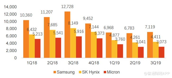 图 13:Samsung、SK Hynix、Micron DRAM 季度营收 单位:百万美元