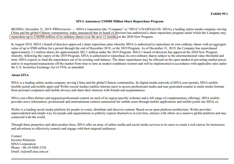 新浪董事会已批准2020回购计划,授权新浪在2019回购计划到期后,在上述价值上限和期限内回购公司普通股。