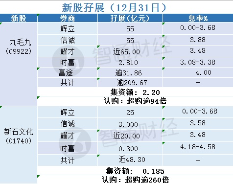 智通财经APP获悉,12月31日,九毛九(09922)、新石文化(01740)、丽年国际(09918)、三和精化(00301)、文业集团(01802)、中国宏光(08646)、北控城市资源(03718)、Infinity L&T(01442)、尚晋(02528)、CTR(01416)、旷世(01925)、天泓文创(08500)、 中关村科技租赁(01601)、驴迹科技(01745)、GHW(09933)、隽思集团(01412)、佳辰控股(01937)、华和控股(09938)、汇景控股(09968)、Hygieia(01650)、 艾德韦宣(09919)正在招股中。