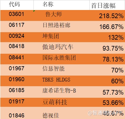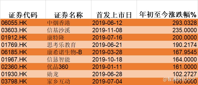 说到新股表现,最重要的莫过于“首日收盘涨幅”。智通财经APP查询到,2019年港股市场“上市首日涨幅”排名前十的新股是: