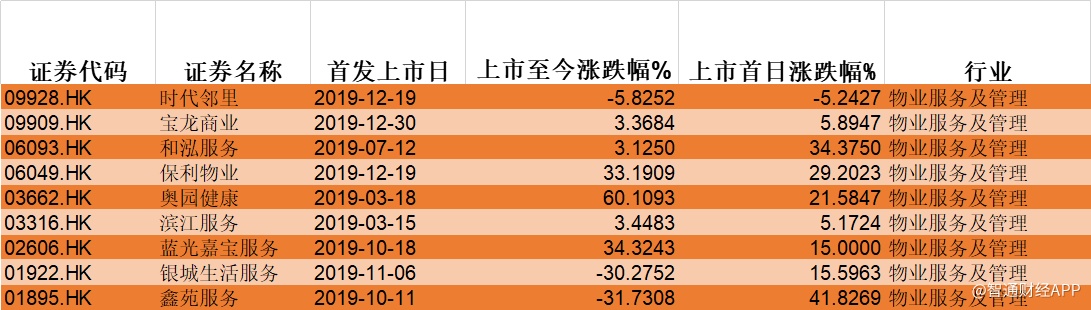 2019年的物业新股堪称香饽饽。在2018年上市的物业股,只有新城悦首日上涨3.79%,其他的首日表现都不太理想。2019年上市的9只物业股,只有时代邻里(09928)一家首日出现下跌。像鑫苑服务、和泓服务首日涨幅在30%以上。