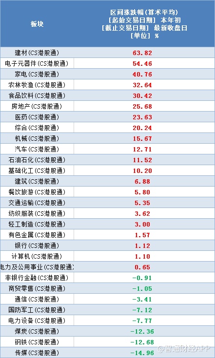 港股通行业类平均涨幅为11.97%,建材板块年涨幅63.82%居首