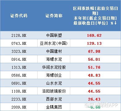 据智通财经APP了解,建材板块主要以水泥股为主,包括亚洲水泥(中国)、中国建材、海螺水泥、华润水泥、山水水泥、西部水泥和金隅集团。从市场表现来看,建材板块成分股除了金隅集团,其余均取得双位数涨幅,其中亚洲水泥(中国)在2019年成功实现翻倍,累计涨幅为131.50%。