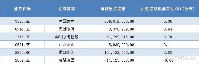 事实上,除了亚洲水泥(中国),中国建材、海螺水泥、华润水泥、山水水泥、西部水泥的港股通持股均有所增长。其中,龙头中国建材港股通持股量增加明显,港股通持股比例增幅为5.35%;基本面相对较弱的金隅股份则遭到国内资金的冷落,港股通持股比例降幅为-0.61%。