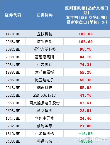 电子元器件板块的表现仅次于建材板块,伴随着A股科技股的5G和国产替代升浪,同步走强。具体来看,丘钛科技、舜宇光学科技、富智康集团、中芯国际、建滔积层板、比亚迪电子、瑞声科技等今年以来累计涨幅均超50%。