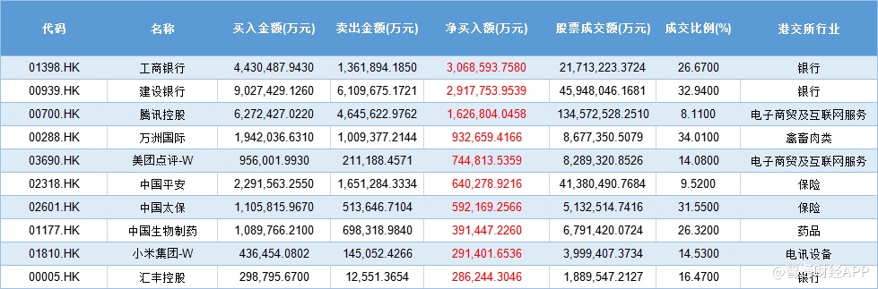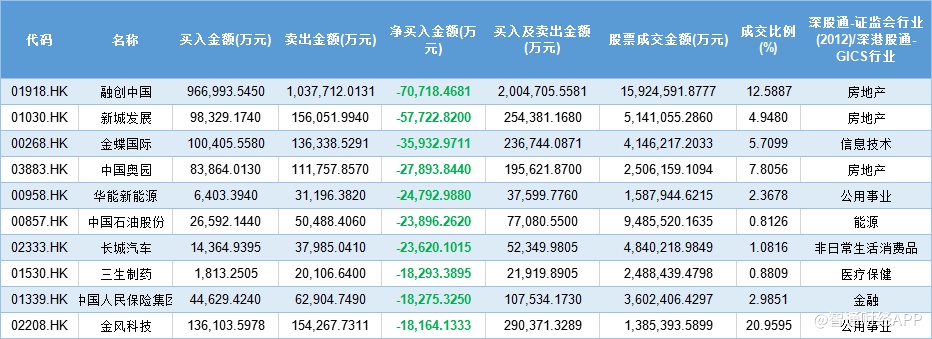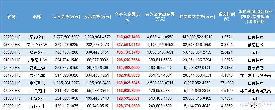 从资金动向来看,腾讯控股、美团点评-W、建设银行、小米集团-W成为深港股通资金的主要买入标的,净流入资金均超20亿港元,分别为71.66亿港元、63.75亿港元、43.57亿港元和20.87亿港元。而融创中国、新城发展、金蝶国际则成了则呈现出资金流出的状态,分别净流出7.07亿港元、5.77亿港元和3.59亿港元。