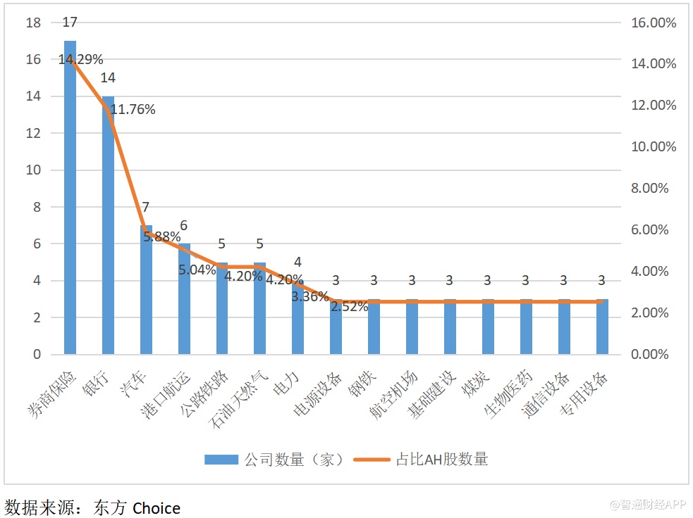 智通财经APP整理了119只AH分布的行业,最多的为券商保险行业,有17只个股(其中券商12家),其次分别为银行、汽车、港口航运、公路铁路、石油天然气及电力,分别有14家、7家、6家、5家、5家及4家,上述7大行业合计58家,占比48.74%。