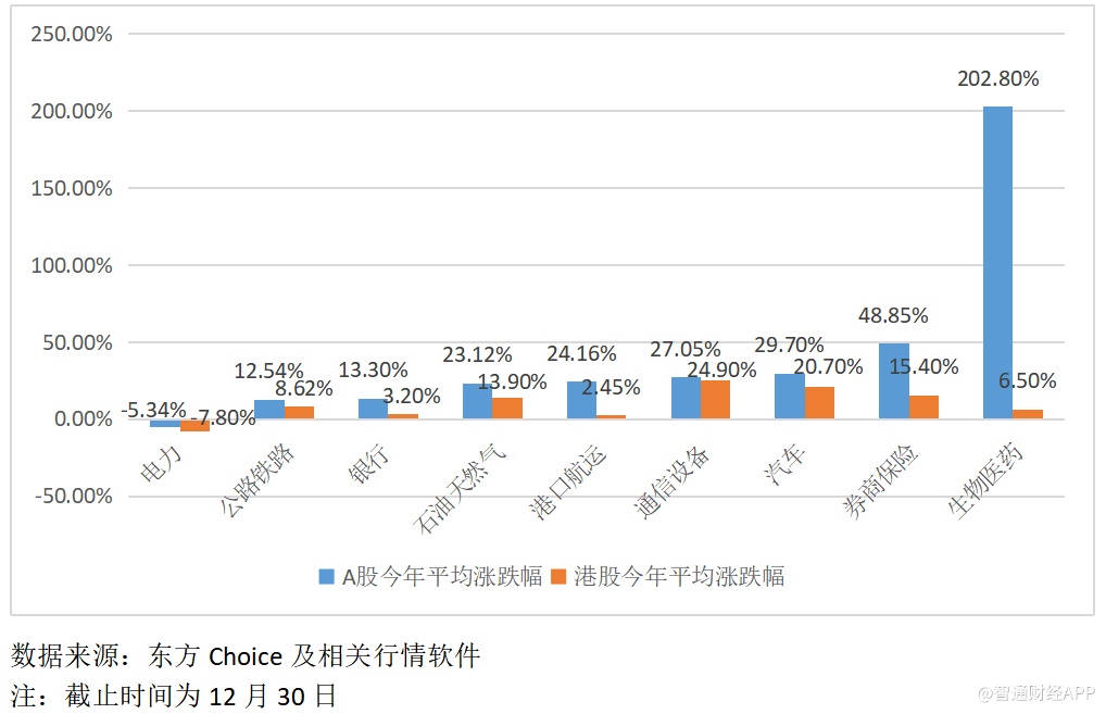 2019年,除了电力行业的AH股均下跌外,其他行业均录得涨幅,但H股行业涨幅均弱于A股,当然有些行业AH股涨幅还是比较接近的,比如通信设备及汽车行业。不过生物医药行业的AH股涨幅差距比较大,其实有一定的特殊性。